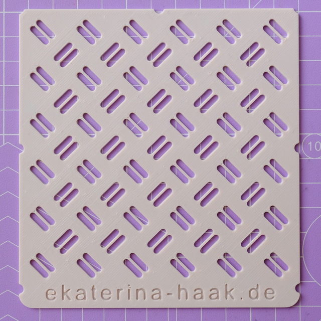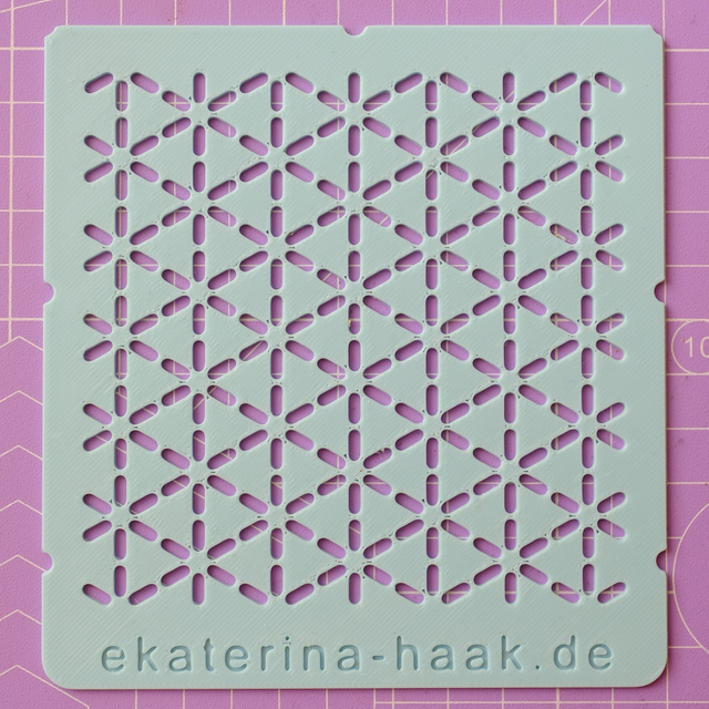 Die Sashiko-inspirierten Schablonen entstehen in unserem kleinen Mülheimer Atelier – in Mini-Batches, einzeln geprüft und mit Ökostrom produziert. Jede Schablone der aktuellen Kollektion hat ein sanft changierendes Cotton-Candy-Farbspiel aus zartem Rosa und hellem Blau. Die Winteredition wird auf einer speziellen Druckbasis gefertigt, sodass eine Seite schimmernd erscheint. Die kleinen Kerben am Rand ermöglichen es dir, Muster nahtlos fortzusetzen – perfekt, wenn der Riss größer ist oder die Form erweitert werden soll.